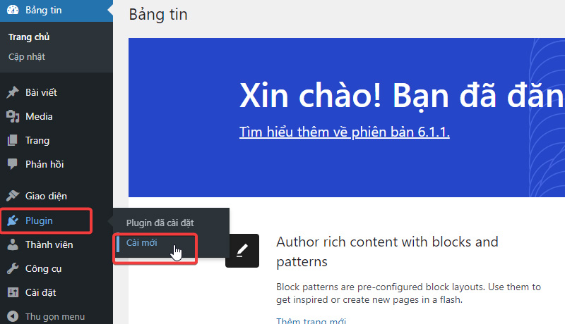 - Truy cập Bảng điều khiển (Dashboard) → Plugin → Cài mới (Add New).